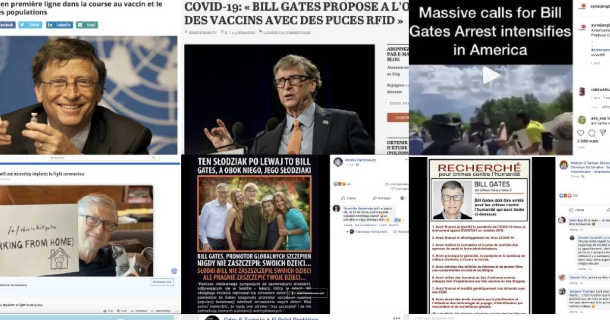 Une vidéo en anglais l'accusant, entre autres, de vouloir "éliminer 15% de la population" via les vaccins et de greffer des puces électroniques aux gens, a, à elle seule, cumulé près de deux millions de vues sur YouTube en moins de deux mois.