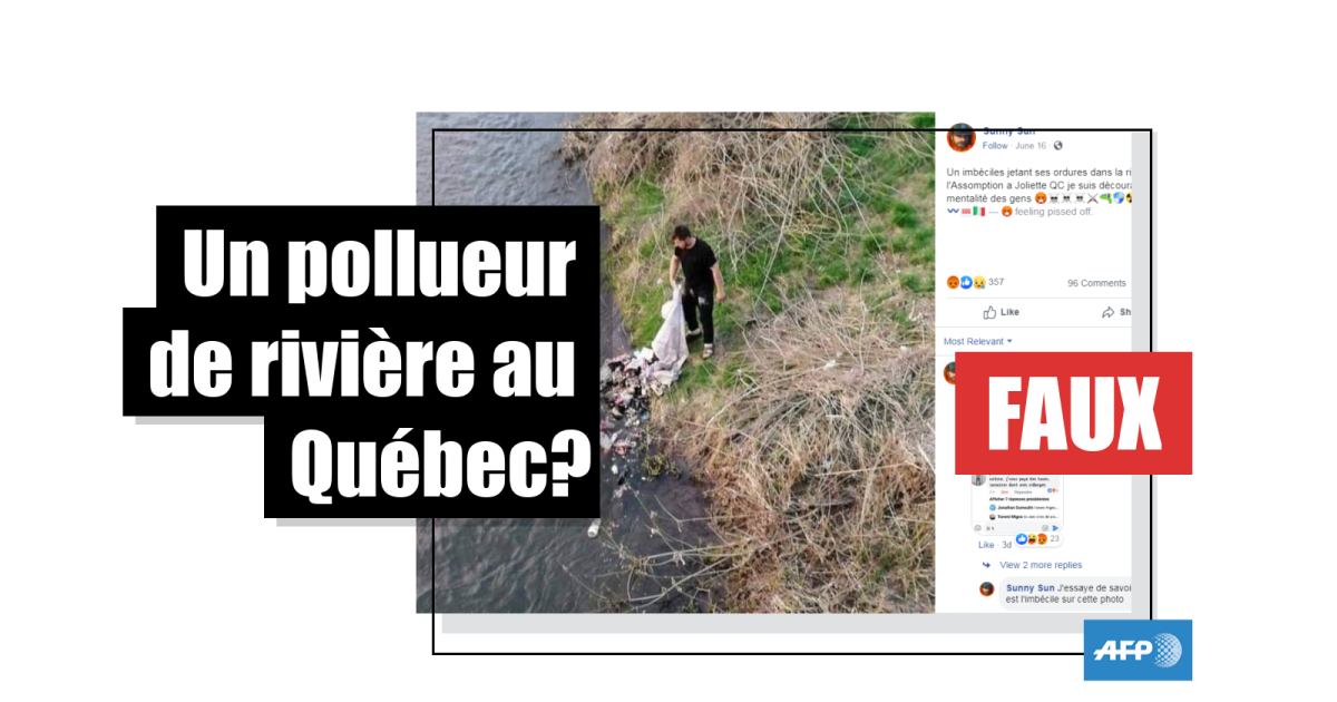 “Un imbéciles jetant ses ordures dans la rivière l’Assomption a Joliette QC je suis découragée de la mentalité des gens”, se désole l’auteur "Sunny Sun" d’une publication Facebook partagée 4.900 fois en quatre jours. Sur la photo, on voit un homme au bord d’une rivière, tenant un grand sac d'ordures dont le contenu a été déversé dans la rivière.