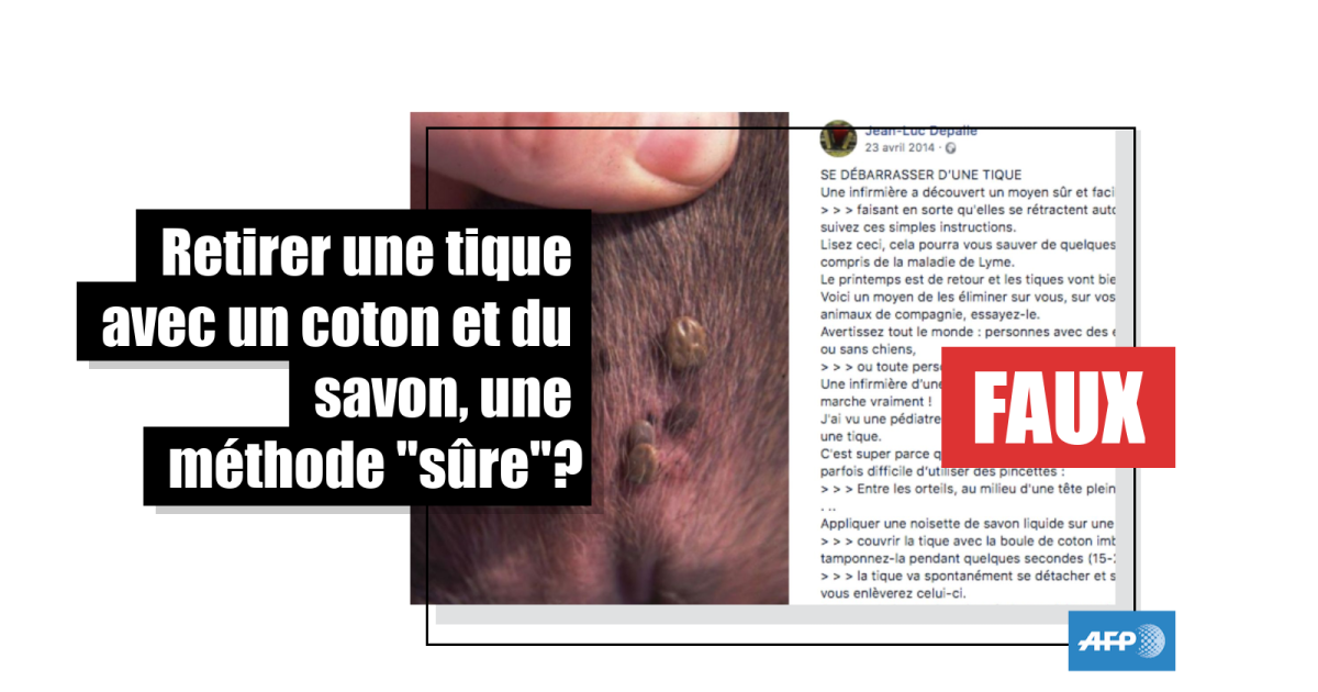 "Voici un moyen d’éliminer [les tiques] sur vous, sur vos enfants, sur vos animaux de compagnie [...] Appliquer une noisette de savon liquide sur une boule de coton, couvrir la tique avec la boule de coton imbibée de savon et tamponnez-la pendant quelques secondes (15-20), la tique va spontanément se détacher et se coller au coton". C’est ce que recommande une publication du 23 avril 2014, partagée à plus de 50.000 reprises sur Facebook et préconisant cette méthode "sûr[e] et facile" pour enlever les tiques.