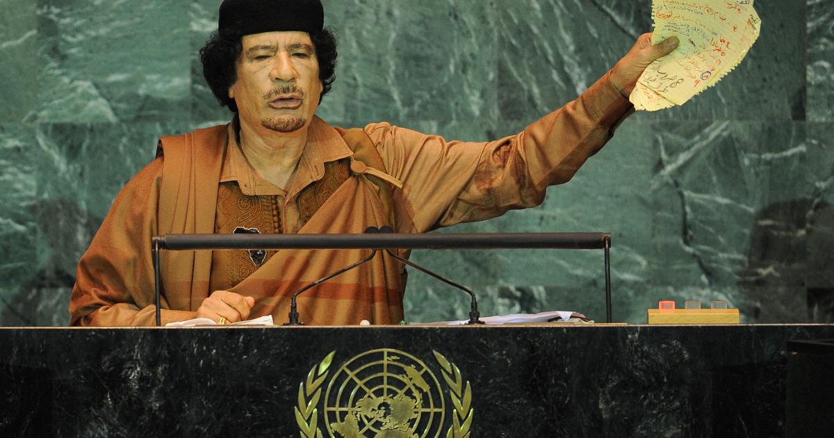 Son discours devant la 64e Assemblée générale de l’ONU en 2009 était sa première intervention devant les Nations unies en quatre décennies au pouvoir. L'intervention, bien plus longue que prévue, est visible dans son intégralité sur YouTube. On peut trouver ici la dépêche de l'AFP qui y a été consacrée à l’époque. Il s'en était pris en particulier à la domination exercée sur le Conseil de sécurité par ses cinq membres permanents (Chine, Etats-Unis, France, Grande-Bretagne et Russie) et à leur droit de veto.